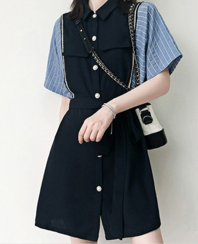 The elegant short sleeves and the unique color-blocking details add a modern twist to a classic silhouette, making it perfect for both casual outings and special occasions. Available in a classic black that pairs well with any accessory, this dress is a versatile addition to your wardrobe.